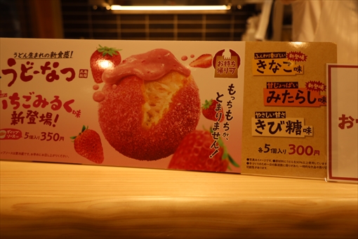 栄・セントラルパーク地下街の丸亀製麺で、新メニューの「うどーなつ」をい ただきました。今日から販売がはじまった「うどーなつ」。いちごみるく味、 きなこ味、みたらし味の3種類が用意されています。今日はきび糖味をいただ きました。きび糖味は、きび糖のやさしい甘さが、もちもち食感のうどーなつ を引き立てます。(2025年4月15日)