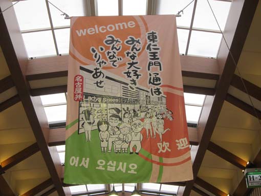 大須商店街東仁王門通アーケードには、名古屋弁のガイド垂れ幕が3枚掲示さ
